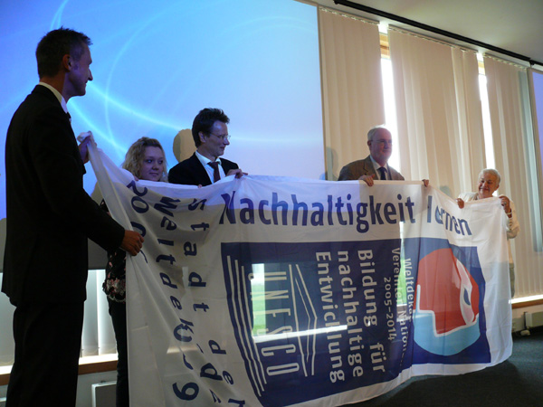 Mit UN-Dekaden-Fahne: Oberbürgermeister Frank Baranowski, Marie-Claire Delarber (Schülerin), Werner Rybarski (Leiter des aGEnda 21-Büros), Rüdiger Höcker (Superintendent des Ev. Kirchenkreises Gelsenkirchen und Wattenscheid) und Ingrid Stange (1. Vorsitzendes des aGEnda 21-Fördervereins)