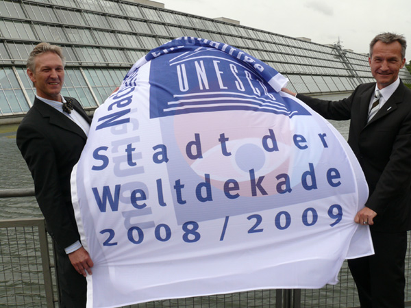 Mit der offiziellen Un-Dekaden-Flagge: Prof. De Haan und Oberbürgermeister Frank Baranowski