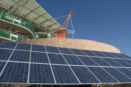 Wenn der WM-Ball über das satte Grün des Mbombela-Stadions in der südafrikanischen Stadt Nelspruit rollte, dann kickte auch Gelsenkirchen mit, obwohl die gebürtigen Gelsenkirchener Manuel Neuer und Mesut Ösil hier gar nicht am Ball waren. Durch die Unterstützung des aGEnda 21-Fördervereins konnten rund 20.000 Euro nach Südafrika fließen. Die Spendenerlöse aus der Solarstadt Gelsenkirchen sorgen ab sofort in Nelspruit, Hauptstadt der nordrhein-westfälischen Partnerprovinz Mpumalanga, für Energie aus der Kraft der Sonne. Insgesamt 33 Solarpanels tragen ihren Teil zur Beleuchtung im Mbombela-Stadion bei. Rund fünf Tonnen des klimaschädlichen Gases Kohlendioxid werden so jährlich eingespart.