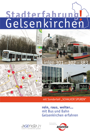Sightseeing mit Bus und Bahn? Das geht. Wie, zeigt das vom aGEnda 21-Förderverein mit freundlicher Unterstützung der BOGESTRA AG herausgegebene Buch "Stadterfahrung Gelsenkirchen – rein, raus, weiter ... mit Bus und Bahn Gelsenkirchen erfahren". Entlang der Straßenbahnlinien 301 und 302 sowie der Buslinie 383 hat der aGEnda 21-Arbeitskreis Nachhaltiger Tourismus 15 Rundgänge zusammengestellt, auf denen sich Gelsenkirchen im wahrsten Sinne des Wortes erfahren lässt. Und das ganz ohne Stau und Parkplatzsuche.