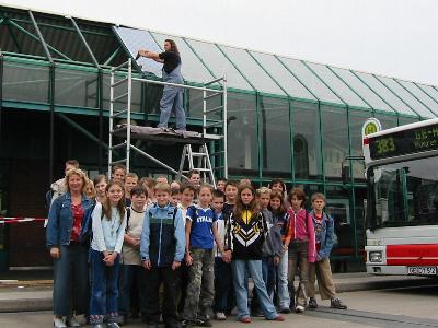 Die Freude beim aGEnda 21-Arbeitskreis Schule ist groß: Auf der Überdachung des Gelsenkirchener Busbahnhofs am Hauptbahnhof wurde am 7. und 8. Juli 2004 die zweite Eine-Welt-Solaranlage der Stadt errichtet. Schon einen Tage später kann sauberer Strom ohne Kohlendioxid erzeugt werden. 4 Tonnen Kohlendioxid werden so jährlich der Umwelt erspart. Rund 35.000 Euro aus den Umweltsponsorenläufen Gelsenkirchener Schülerinnen und Schüler fließen in den Bau der 60.000 Euro teuren 8 kw-Anlage. Die restliche Summe stammt aus Fördertöpfen des Landes und der Europäischen Union.