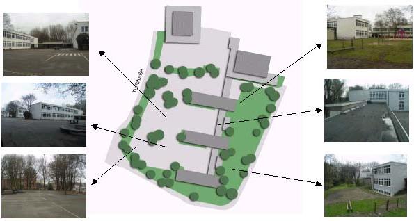 Das Schulgelände weist einen hohen Versiegelungsgrad auf und das anfallende Regenwasser wird vollständig in die Kanalisation abgeführt. Der Wille an diesem Zustand etwas zu verändern ist bei allen Beteiligten vorhanden. - Optimale Bedingungen, um einen neuen Umgang mit Regenwasser an dieser Schule zu erreichen.