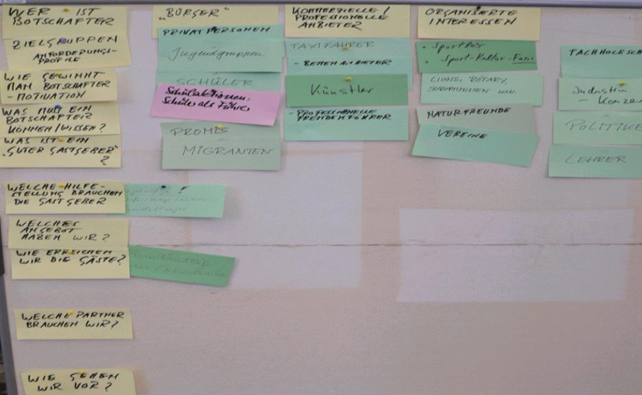 Ein weiterer Gesichtspunkt war ebenfalls in allen drei Gruppen Thema: Hinweise auf noch fehlende Partner. Dabei waren sich die Beteiligten einig, dass diese Partnerwerbung nicht überstürzt, sondern erfolgsorientiert und deshalb mit Bedacht anzugehen ist: Manche künftige Mitstreiter sind dann gut zu begeistern, wenn sie mitbekommen, da tut sich was Visionäres auf und daran wird sogar handfest gearbeitet. Andere wiederum sind nach aller Erfahrung erst dann anzusprechen, wenn eine Idee soweit zum Projekt geworden ist, dass sie ihren speziellen Anteil an der Umsetzung und am Erfolg direkt erkennen und einschätzen können… Pünktlich um 13.30 wurde die Werkstatt beendet.