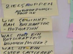 Die Aufteilung in diese drei Gruppen geschah schnell: Die allgemeine Lust, jetzt wirklich an die Arbeit zu gehen, war unverkennbar. Die von der Moderation vorgegebenen Diskussionspunkte waren: Was sind die nächsten Schritte? - WER macht WAS? Unser jour fix? Unser nächstes Treffen? In allen drei Gruppen wurden diese Punkte erfolgreich bearbeitet: Sie haben inhaltlich die nächsten Schritte in Fragen oder Hausaufgaben gefasst, haben Verantwortlichkeiten abgesprochen und nächste Termine verabredet. Die "Ergebnistafeln" zeigen, wie intensiv diskutiert wurde und was alles an zu vertiefenden Ideen und Fragen bereits auf der Tagesordnung steht. Sie zeigen trotz der Fülle – und das war wohl allen bewusst - nur eine erste Annäherung an die praktischen Aufgaben.